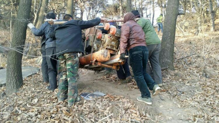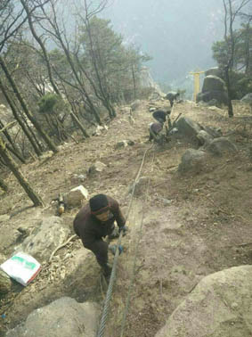 因貨索沒建好,工地又要急著開工,施工用設(shè)備全靠人力從山腳搬運(yùn)至海拔1000多米的山頂。
