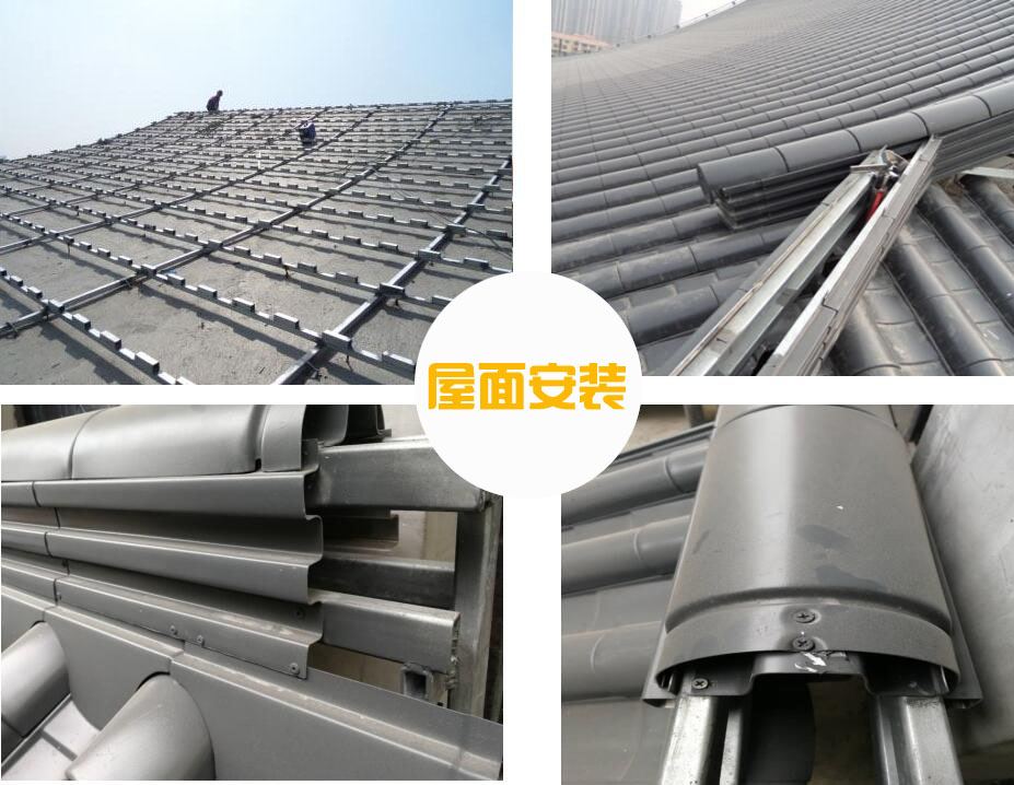 安裝方式上采用不銹鋼龍骨鋪設,將瓦片通過焊接,打螺絲的方式固定屋面;