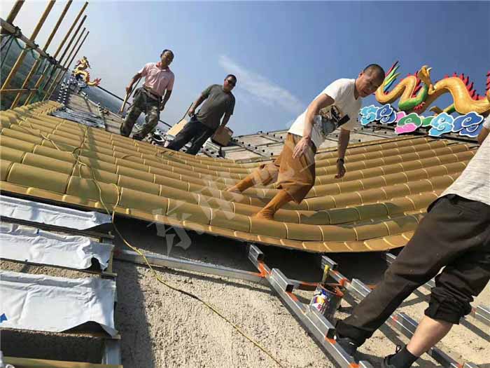 7月30日山東濰坊寺廟瓦屋面仿古金屬工程施工順利進(jìn)行,洪福寺屋面工程約3000平米,鋁瓦屋面安裝簡(jiǎn)單,高效;東申鋁瓦-寺院專用仿古瓦,值得信賴.