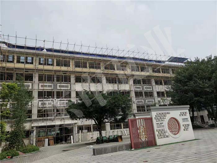 成都外國語學(xué)校屋面改造,使用東申仿古鋁瓦-連體瓦;共計2800平方,15天快速完工,中式仿古屋面,彰顯校園集聚古文化氣息.