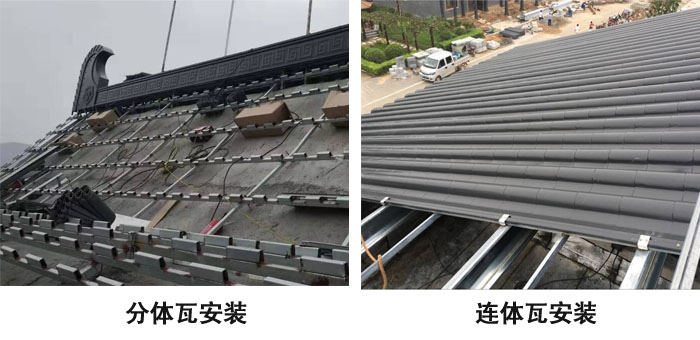連體仿古金屬瓦在安裝的時候,當屋面下面的龍骨鋪設之后后,是整片整片的安裝,打螺絲固定,按照整個屋面來基本固定幾個需要銜接的地方就可以在屋面固定好;整體安裝過程很省事兒,不像分體的需要安裝更多的支架來固定每個瓦片,相對來說工序上簡單了更多;