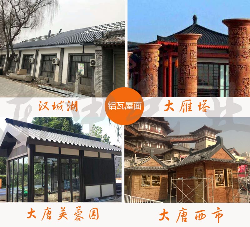 鋁瓦在西安的使用也是非常廣泛,像大唐西市,漢城湖,大雁塔,大唐芙蓉園這些地方的仿古屋面換瓦都已經(jīng)使用鋁瓦,來西安的朋友或者想來隨便旅游的都可以去這些景點(diǎn)看看,還能觀賞一下鋁瓦屋面的風(fēng)姿。