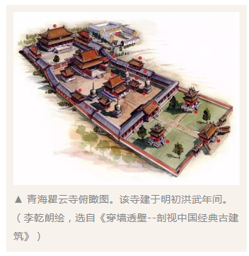 凡主要殿堂必有其附屬建筑物,聯(lián)絡(luò)周繞,如配廂、夾室、廊廡、周屋、山門、前殿、圍墻、角樓等等,成為庭院的組織。除佛塔以外,單座建筑物鮮有呈露其四周全部輪廓,使人得以遠(yuǎn)望其形狀的。與歐洲建筑物不同,“中國建筑物之完整印象,必須并與其院落合觀之!雹