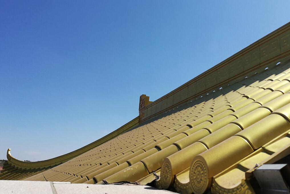 中式仿古金屬瓦的普通使用顏色最多的為金色和灰色;像大型寺廟,寺院,廟宇等都使用的金色;像一些仿古公共建筑,仿古街道改造,四合院等等使用的是灰色比較多,基本一般的建筑屋面都使用的是這兩種顏色.