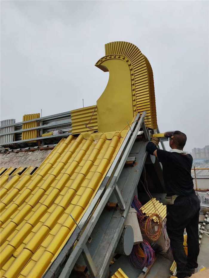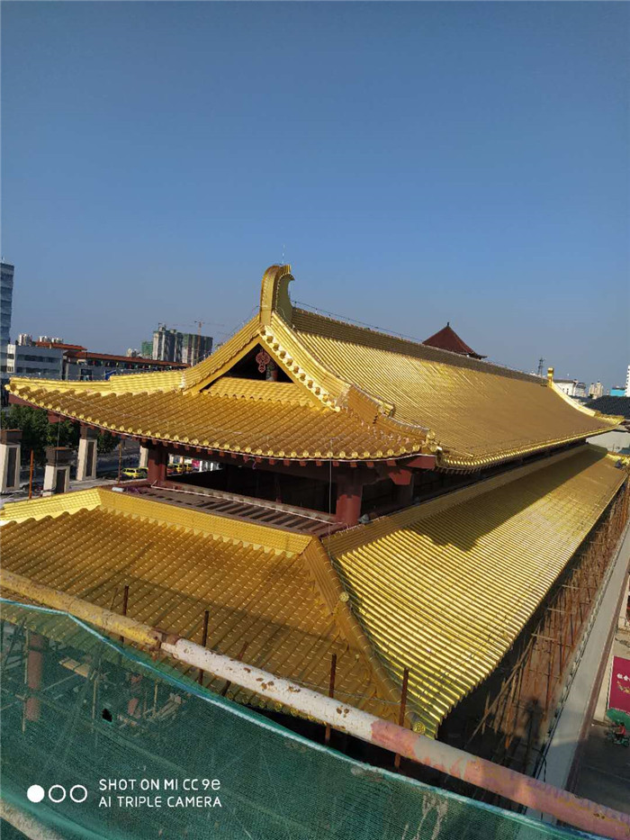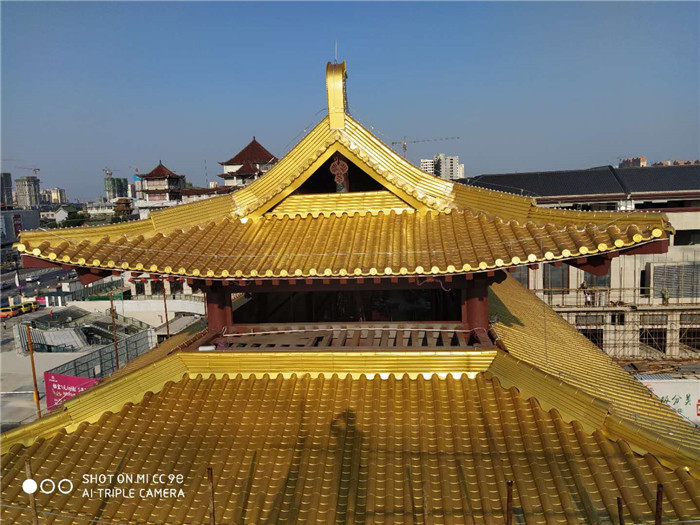 河北邢臺(tái)廊橋項(xiàng)目鋁瓦屋面工程正在施工,面積約1100平方米,使用東申金色,三號(hào)瓦,厚度1.2厚;