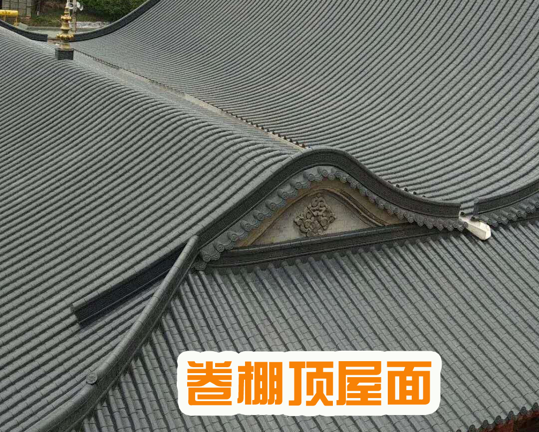 卷棚式屋頂,又稱元寶頂,是古代中國建筑的一種屋頂樣式。為雙坡屋頂,兩坡相交處不作大脊,由瓦壟直接卷過屋面成弧形的曲面,卷棚頂整體外貌與硬山、懸山一樣,唯一的區(qū)別是沒有明顯的正脊,屋面前坡與脊部呈弧形滾向后坡,頗具一種曲線所獨有的陰柔之美。根據(jù)左右山墻的懸山式和硬山式不同,卷棚頂可分為懸山卷棚、硬山卷棚、歇山式卷棚。