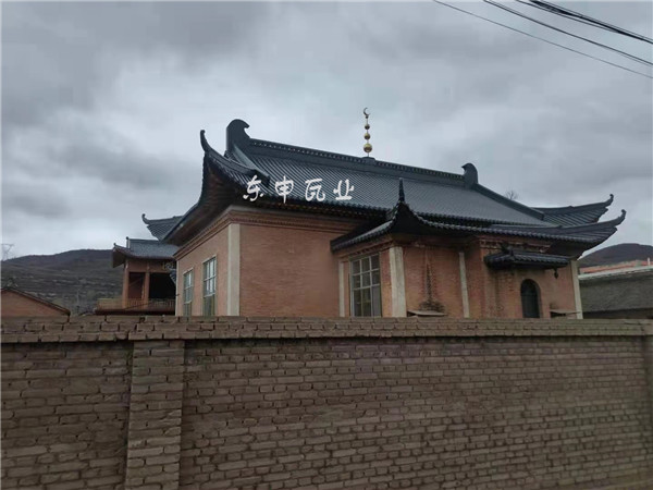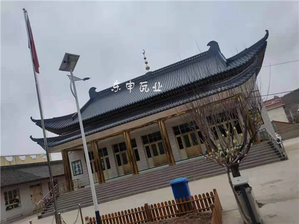 甘肅閆家清真寺屋面改造成新中式風(fēng)格,屋面面積約610平方米,采用3號分體瓦,厚度1.2mm,顏色選擇中灰色,材料為鋁合金金屬材料,寺院采用壽命達百年不用維護和修繕屋面;