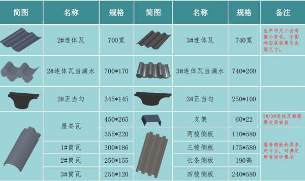 還有一種規(guī)格的是連體屋面瓦,它是一體的,是一大片一大片的一種瓦片,主要做的是2號瓦和3號瓦兩種類型,具體的規(guī)格如下,