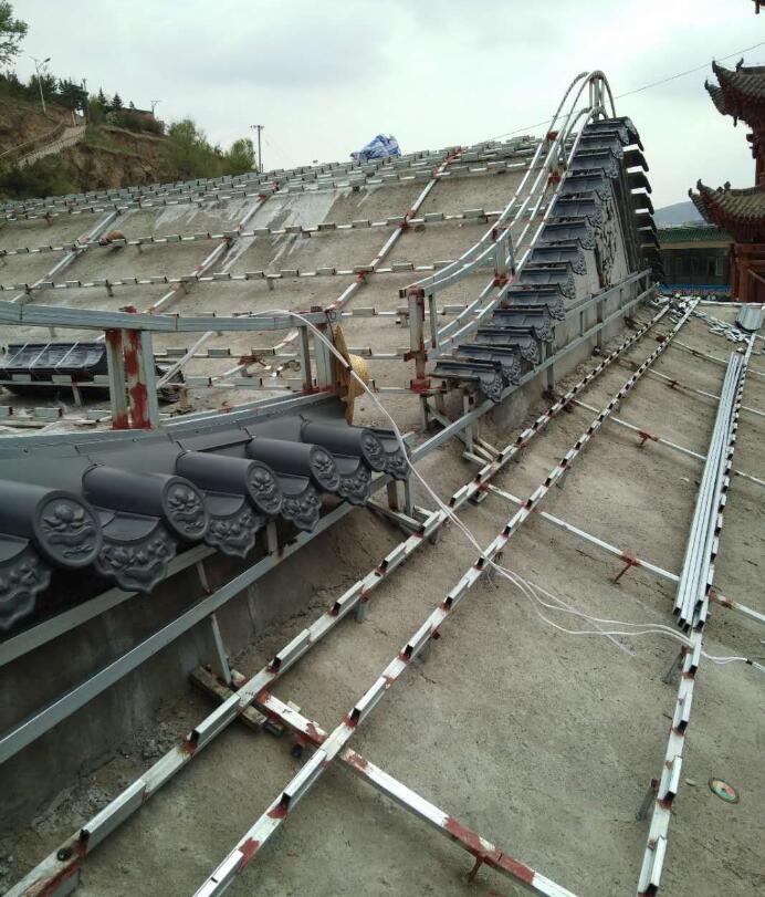 這步安裝主要遵循次序的先后就可以了,基本上很簡單了,首先從屋檐開始安裝板瓦滴水,也被稱為滴水瓦,然后再把筒瓦瓦當(dāng)固定在滴水瓦上,后面就直接依次焊接和用鉚釘固定筒瓦和板瓦即可,基本上小工都可以安裝。