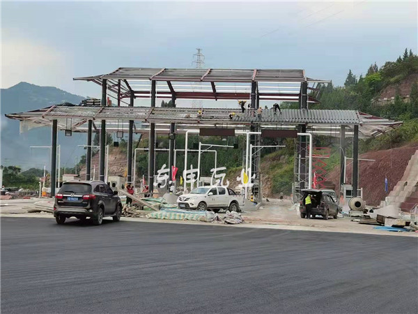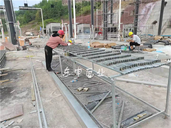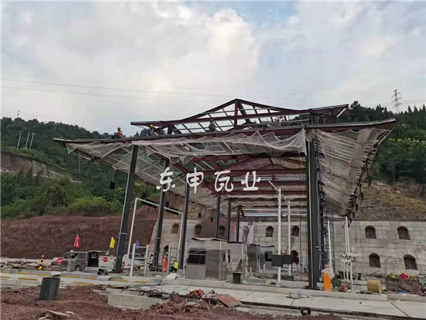 重慶收費站屋面金屬瓦項目工程正在安裝施工中,主要采用東申鋁瓦,2號分體瓦,厚度1.2mm,顏色:灰色;新中式仿古風(fēng)格;采用明清荷花,瓦當(dāng)?shù)嗡畧D案;總共收費面積約2600平方米。新中式仿古風(fēng)格,采用明清荷花,瓦當(dāng)?shù)嗡畧D案;彰顯整體收費站風(fēng)采。