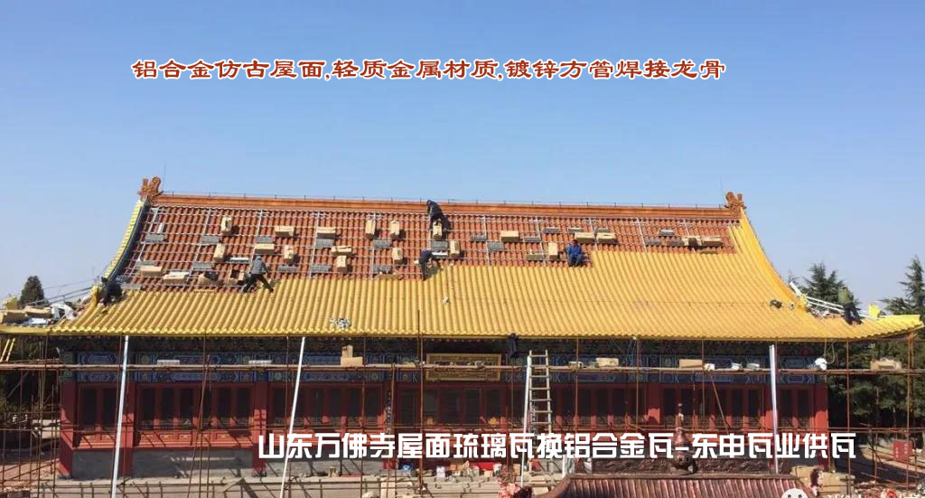大雄寶殿屋面的瓦如果要拆掉從新更換,可能要把殿里的東西全部搬走,寺院殿里的東西不同與普通的房子,很多高的佛像,還有一些墻上的畫(huà)像,拆除或者保存,在移動(dòng)地方,也是非常麻煩的;在更換的過(guò)程中,屋子里面也許在拆和搬運(yùn)的過(guò)程中,會(huì)不小心損傷物品和佛像,也是令師傅們很上愁的一件事,仿古鋁瓦可以解決這個(gè)問(wèn)題,仿古鋁瓦本身輕質(zhì),又是全屋面金屬系統(tǒng),直接將新瓦蓋到舊瓦的上面,這樣就更加方便了,不動(dòng)殿里的任何一個(gè)東西,又能做到更換屋面瓦。