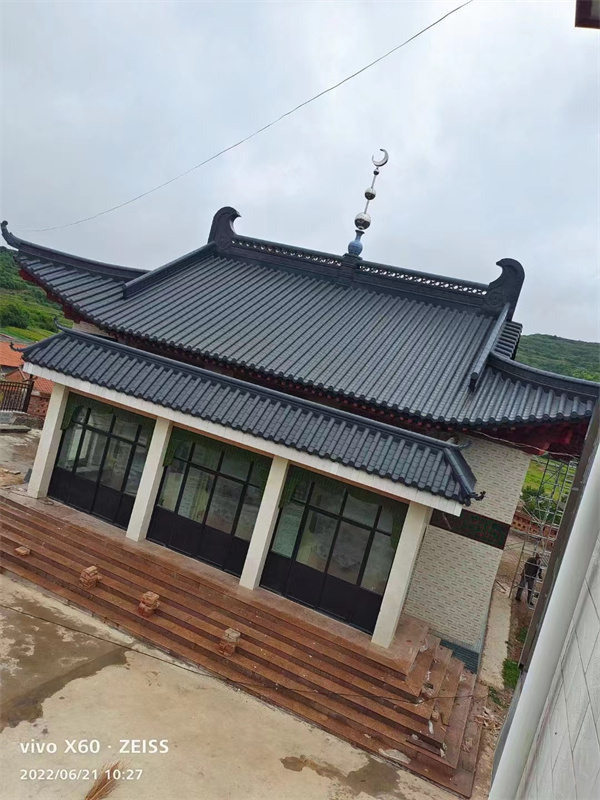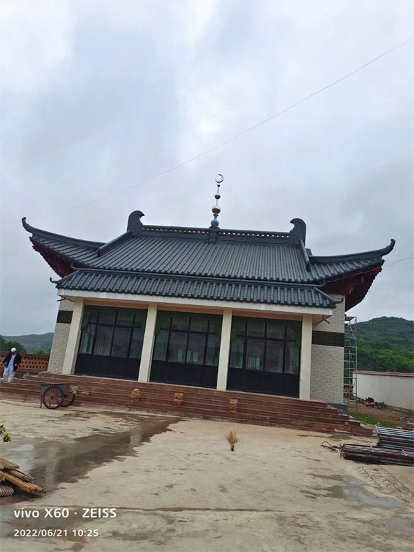 甘肅張家川朝陽清真寺屋面金屬瓦工程采用3號分體瓦,厚度:1.2mm,面積約346個平方;顏色為灰色:風(fēng)格:新中式仿古風(fēng)。清真寺專用仿古瓦就選擇東申鋁瓦,適合西北寺院屋面,可達(dá)80年長久壽命。