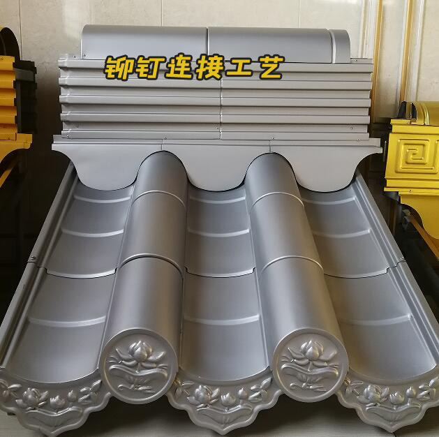 古建筑銅瓦施工工藝第一種就是:龍骨底層焊接,表面螺絲釘掛瓦方式,板瓦和筒瓦相間連接,銅瓦的板瓦與板瓦之間采用搭接臺(tái)的連接方式,筒瓦與筒瓦之間采用卡扣方式連接;板瓦在底層,直接與底層龍骨采用鉚釘連接;這個(gè)屋面瓦與底層金屬龍骨緊密相連。