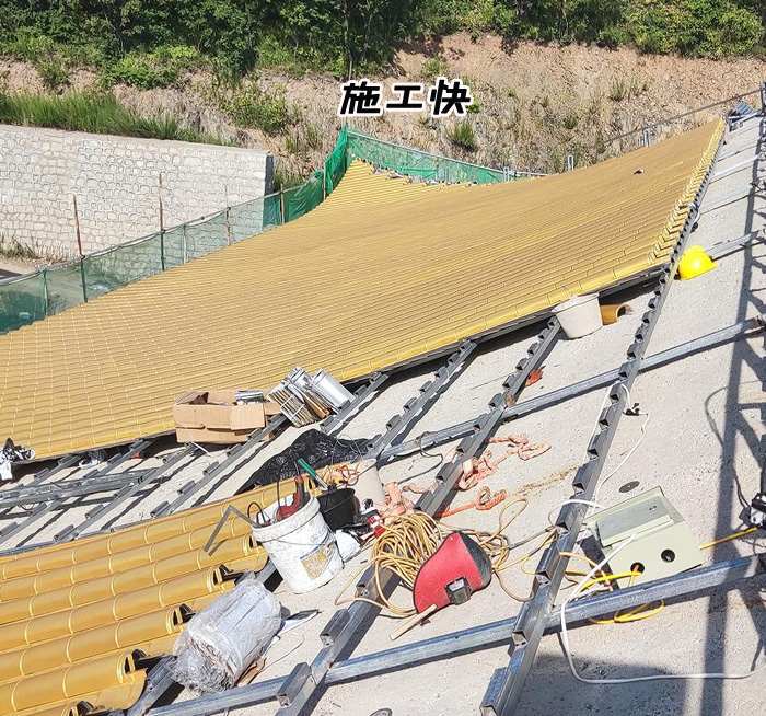 金屬瓦重量輕,施工簡單,對于混凝土屋面來說,只需要給底層打預(yù)埋,上面直接鋪設(shè)鍍鋅方管作為龍骨,上面直接打鉚釘掛瓦即可;不需要傳統(tǒng)的沉重的水泥沙子,和復(fù)雜工序;隨時可施工。