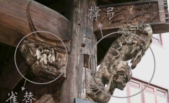 清代,“撐弓”逐漸演變成整塊斜木雕刻,工藝日趨繁瑣,雕工精美,刀法純熟,雕刻內(nèi)容更是豐富多彩。