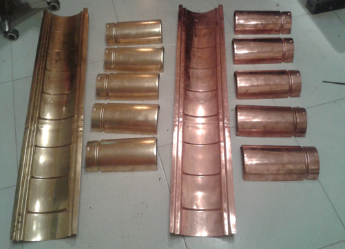 生產(chǎn)方式很簡單,技術(shù)也很初級,大家可以看到非常簡單的設(shè)計;特別是筒瓦的設(shè)計也是靠一個一個打螺絲打上去的連接方式;這個是銅瓦的樣品。整體的瓦當?shù)嗡彩菦_壓成型的。