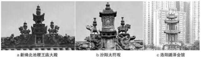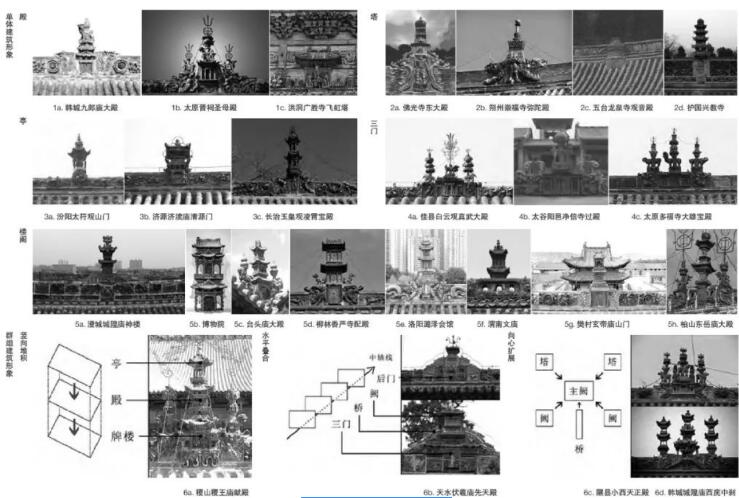 傳統(tǒng)建筑的屋脊裝飾,向來被視為反映特定地區(qū)和時期下民系審美意識的重要參照,其母題極盡豐富,既有以祥禽瑞獸仿生象形者,也不乏借吉祥符號祈福辟邪者。明清以降,脊剎樣式在不同地域顯著分化:官式建筑多不使用;江浙常以瓦片疊出寶瓶、花籃、法輪之類形象點綴;閩粵崇尚裝飾,喜在剪黏花脊上鋪陳戲曲故事,建筑褪為情節(jié)背景;而黃河中游則直接安放樓閣模型,營構(gòu)神圣場域(圖1)。