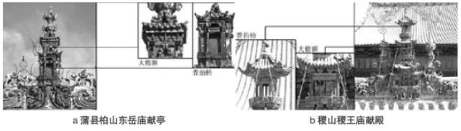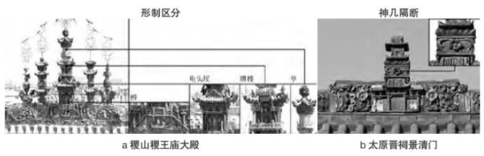 中國傳統(tǒng)建筑構(gòu)件的裝飾旨趣多傾向于仿生(如垂蓮柱、盤龍柱、蟬肚綽木)或擬人(如叉手、櫨斗),屋型脊剎以完全“模型化”的方式打破了既有原則,因借與隱喻等常用手段被建筑形象的自我重組取代,由于兼具豐富的樣式、色彩、光影細(xì)節(jié)與高辨識度的輪廓剪影,反而為觀察者帶來神靈世界的無限遐想。
