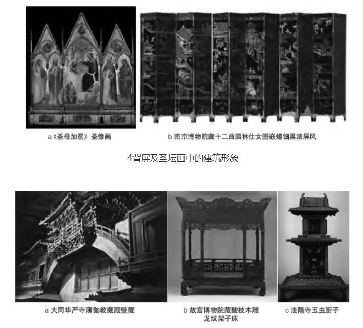 二維媒材的“建筑化”“模型化”裝飾趣味在中西方均廣泛存在,前者如背屏及圣壇畫中的建筑形象,后者則是對前者的邊緣加工。在壁畫、板畫內(nèi)外融合建筑元素的手法自文藝復(fù)興起逐漸出現(xiàn)[15],目的是通過透視誘導(dǎo)在室內(nèi)再造建筑層次以豐富空間感度[16],巫鴻說的“重屏”[17]其實也起到了相似效果(圖4)。繪畫中的建筑形象為觀者提供了錨定于此的文本背景,形成關(guān)聯(lián)于此敘事的超鏈接;對于畫框的“模型化”裝飾則進(jìn)一步模糊了畫布與真實空間的邊界,通過將二維邊框三維化、建筑化,使之趨同于纈取建筑外觀的神龕帳座,塑造出“屋中屋”的復(fù)雜場域感。在中國,此類家具“建筑化”的傳統(tǒng)歷經(jīng)了“結(jié)構(gòu)的建筑化-形式的建筑化-建筑式家具-互動關(guān)系”4個階段后趨于完善[18],成為形式、結(jié)構(gòu)、空間、功能兼?zhèn)涞摹敖ㄖP汀?圖5)。