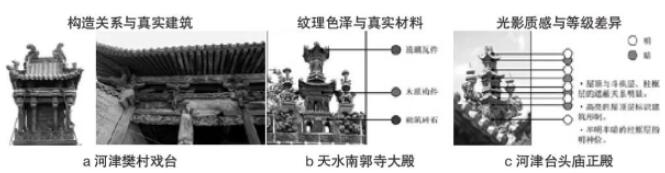屋型脊剎帶來獨特的感知體驗。一方面,觀者自前一院落的門殿內(nèi)遠(yuǎn)望時,過白處理使之突兀于明、暗邊緣,天穹作幕日光剪邊,頗具神性之美;另一方面,屋型脊剎與其下建筑并置,混淆了縮微與真實尺度,對此“模型化”構(gòu)件的觀察喚醒觀者的具身感知20)[16],誘導(dǎo)其依據(jù)人與建筑的經(jīng)驗比例將自身意識縮小后投射其上,“神游”其中。觀者在觀察屋型脊剎的整體形象時,在分辨樣式細(xì)節(jié)、構(gòu)造關(guān)系、紋理色澤、光影質(zhì)感時,均不斷觸發(fā)特定感官體驗,進(jìn)而于腦海中補(bǔ)繪出“天宮”圖景14[24](圖13)。物型比例與樣式細(xì)節(jié)持續(xù)刺激著觀者對日常建筑經(jīng)驗的回憶,進(jìn)而與“天宮”想象間建起虛擬關(guān)聯(lián),因此,恰當(dāng)?shù)姆抡?細(xì)節(jié)豐度與變形程度)成為塑造屋型脊剎的核心議題,在其獨特的觀看距離與視角約束下,“酷肖”注定不是唯一訴求,對于“神似”效果的客觀解析才是重點。