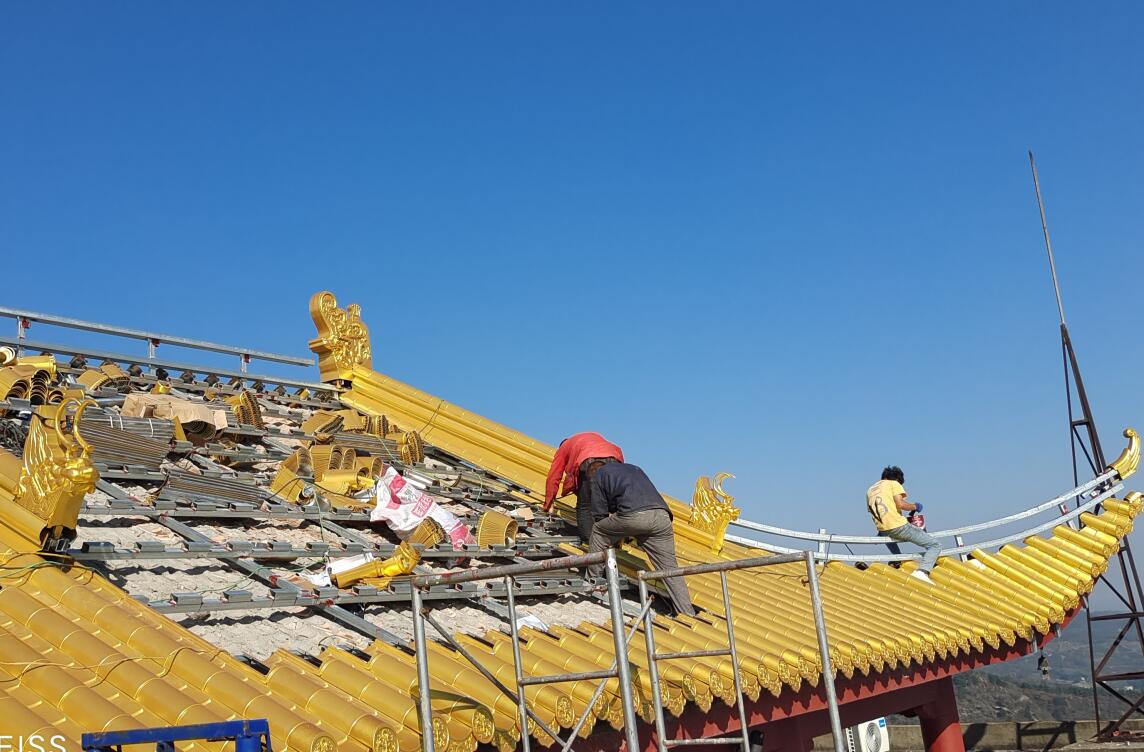 安裝瓦的順序也一定是先安裝板瓦,再安裝筒瓦,順序?yàn)閺奈蓍艿轿菁沟陌惭b順序,邊安裝,邊調(diào)平整個(gè)屋面的效果,只要屋檐這塊安裝對(duì)了,后面直接往上延伸即可,不會(huì)出現(xiàn)大的方向錯(cuò)誤。