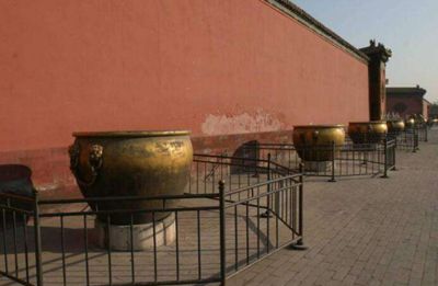 據(jù)《大清會典》記載,紫禁城內(nèi)曾有大缸308尊。由于歷史的變遷,現(xiàn)還剩200余尊。在宮殿前設(shè)置的這些大缸,稱之為“門!,每尊可貯水3000多升,過去由幾十個太監(jiān)專門負(fù)責(zé)管理,每天派勞役從井內(nèi)吊水,一擔(dān)一擔(dān)把缸打滿。夏天要保證水質(zhì)干凈,沒有異味;冬天除在缸口加蓋之外,還在大缸外圍包上一層棉絮外套,在特別嚴(yán)寒的季節(jié)里,要把缸架在特制的石圈上,下燃炭火,晝夜不熄,以免缸水凍結(jié)。