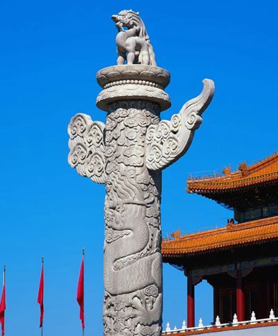 華表常建在重宮殿、陵墓等要建筑屋,主要入口的前端。似柱不是柱,似塔不是塔,是作為一種標(biāo)識的附屬建筑,烘托建筑氛圍。相傳華表是部落時代的一種圖騰標(biāo)志,古稱桓表,柱頂上有一承露盤,呈圓形,以此對應(yīng)天圓地方。上面的蹲獸為傳說中的神獸朝天吼,或稱為望天犼,富有深厚的中國傳統(tǒng)文化內(nèi)涵,“犼”是一種形似犬的瑞獸,根據(jù)所在方位的不同,表達的意義也不相同。天安門后面的一對華表上的石犼面朝北方,望著紫禁城,寓意是希望皇帝不要久居深宮不知人間疾苦,應(yīng)該經(jīng)常出宮體察民情,所以稱“望君出”。而天安門前面的一對石犼面朝南方,寓意皇帝不要久出不歸,故而稱“望君歸”。如此看來,這對華表也不單純是裝飾品而已,還是提醒古代帝王勤政為民的標(biāo)志。