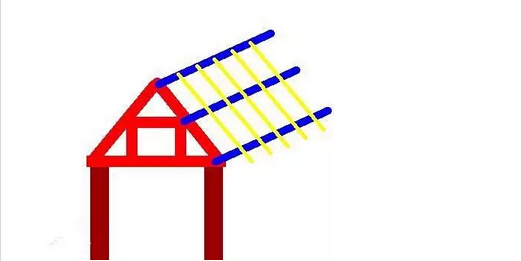房屋的結(jié)構(gòu)大概如圖,黃色的叫椽子,瓦片是架在椽子上的。一般屋頂沒圖里那么陡峭,我們家鄉(xiāng)的房子,